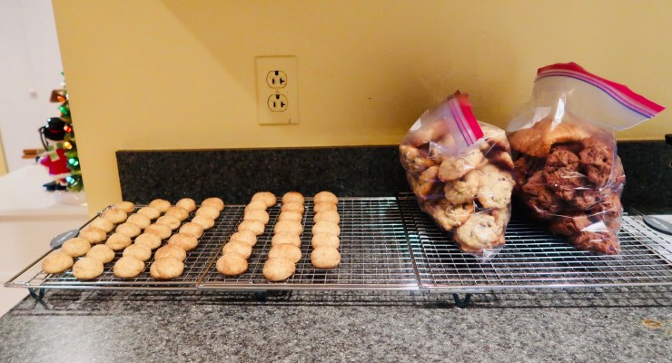 IMG_8391This may seem like a lot (and it actually is), but I make them at the start of the month for the entire month! We will offer these to friends, family, and any coworkers at times as well as visitors to our home. When you are storing them, you place a small piece of bread in with the cookies to keep them moist and chewy. If we run out of any cookies, I’ll top us off with another batch.