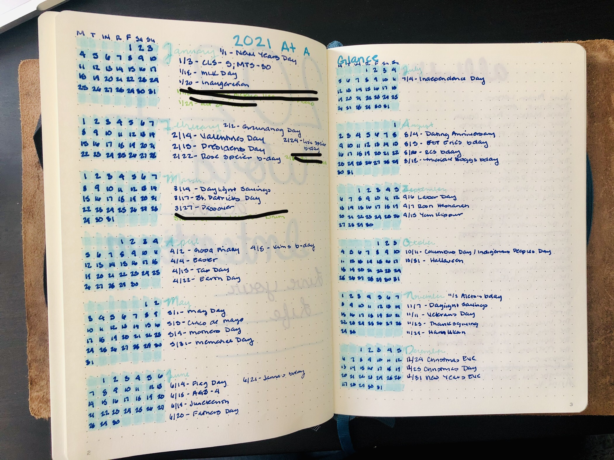 So, my 2021 Bullet Journal. First off we have the long-term planning, marking out all the holidays, important dates, and such. Then I’ve got a spot to write down books that are on my long list of purchasing and/or reading and another section devoted to blog posts and tracking where they are at in the process (this is something new I’m trying out for 2021).