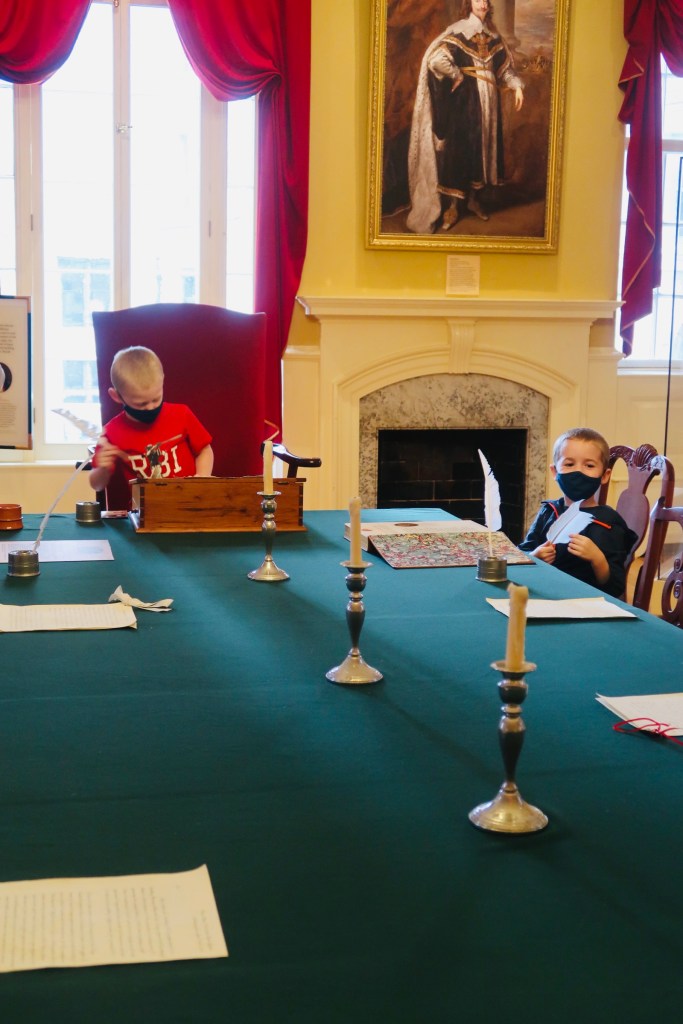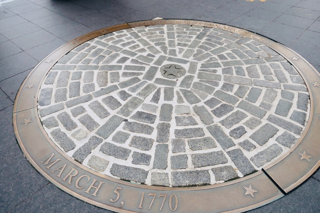 We made a last stop on our first day of the Freedom Trail over to the site of the Boston Massacre and the Old State House. The Old State House is the oldest surviving public building in the city, dating back to 1713. It now serves as a multi functional museum, documenting not only life in Boston, but the revolution, the Boston Massacre, and has a hands on second floor exhibit for kids to see what certain aspects of life were like. The boys especially loved this as they got to play “King” and “Governor” and dictate things. Right in front of the Old State House is a marker for the location of the Boston Massacre. Taking place on March 5, 1770 the Boston Massacre was a fight between the Redcoats and the people of Boston that ended with the death of 5 people. The tension between the two groups of people had finally boiled over and this tragedy became a turning point leading to the fight for independence.