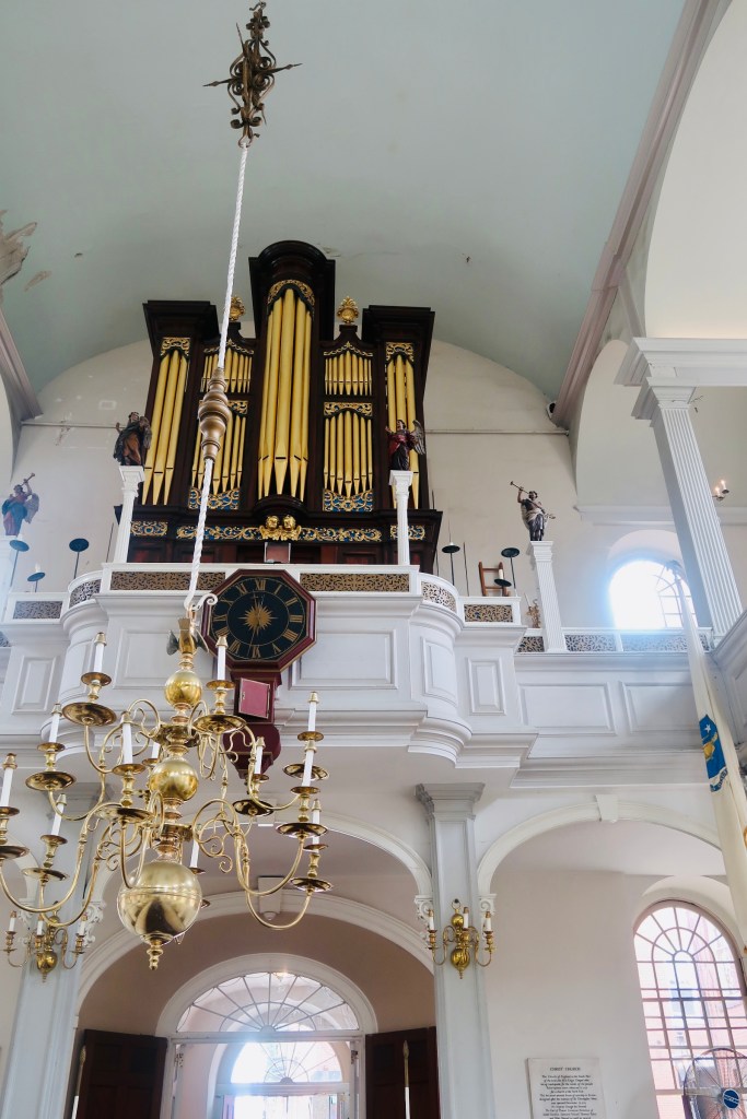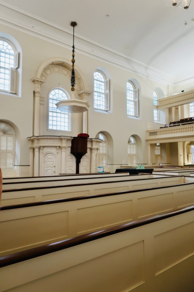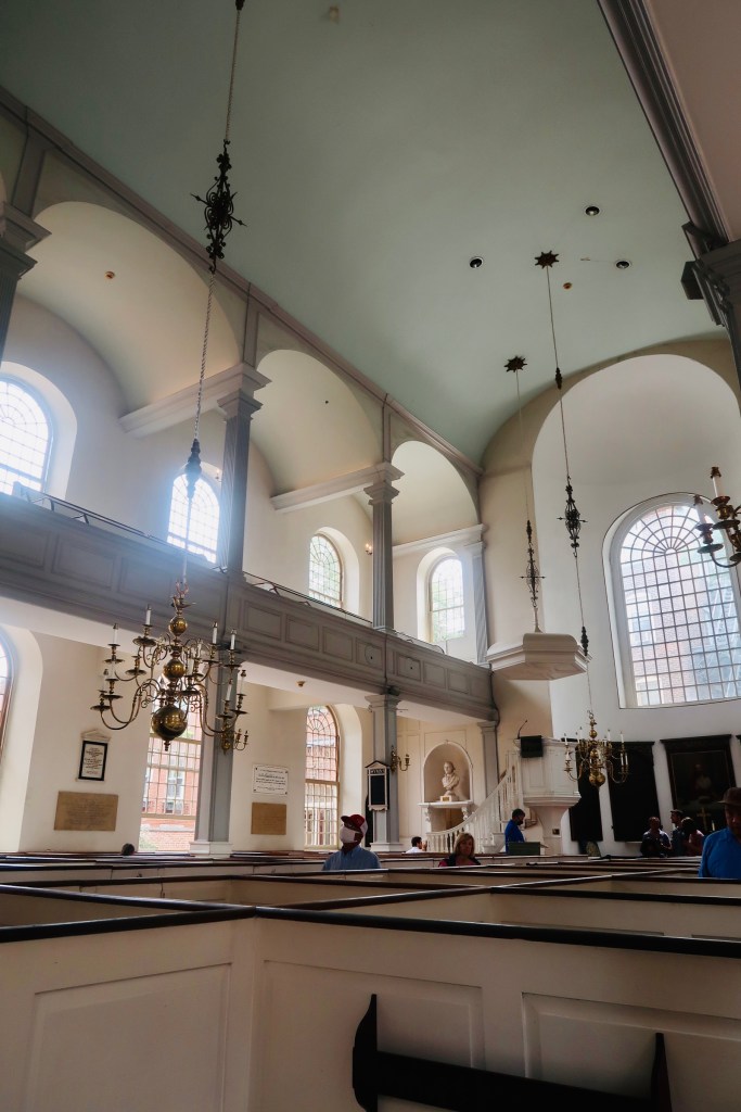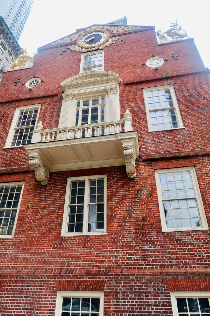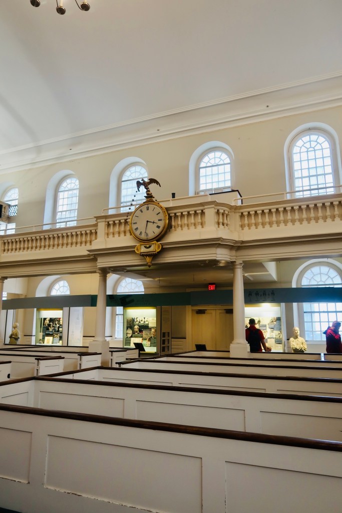 From there we headed over to the Old South Meeting House (this deviates slightly from the trail, but as I said, we split this in half so there was some deviations here and there). The Old South Meeting House is “the room where it happened”. It was the center piece to debate, to sermons, to public meetings. The largest building in colonial Boston, this was originally built as a Puritan meeting house. The congregation boasted members such as Samuel Adams, William Otis, William Dawes, Benjamin Franklin, and Phillis Wheatley, the first women and enslaved women to publish a book. The building also served as THE site, where the Boston Tea Party was decided, with 5,000 men in attendance debating the tax and what to do about it. It now is recognized as the first in what are now regular history conservation projects. But the road was not easy, the building was actually sold in the 1870’s and it took a group of 20 women to save the building from being demolished (which also makes it the first building to be saved due to historical significance- lots of history in just one building). It has been a museum since 1877 thanks to their efforts.