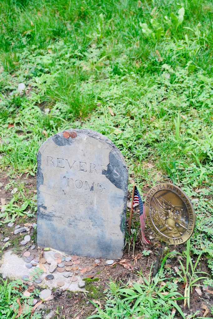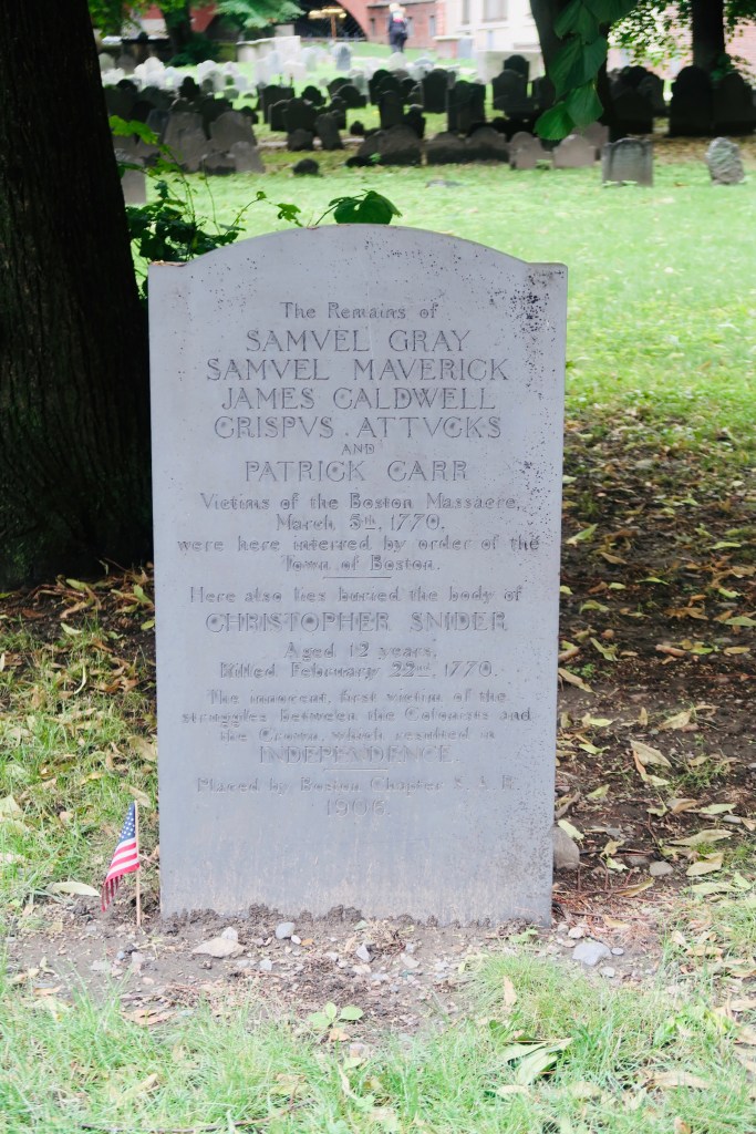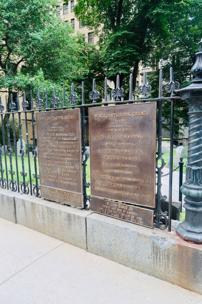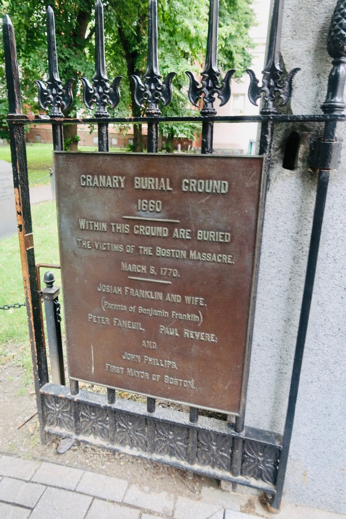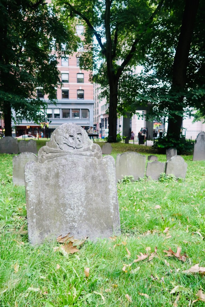 The next stop on The Freedom Trail that we made was to the Park Street Church and Granary Burying Ground. The church dates to the early 1800’s, but the burying ground is the real attraction at this stop. This cemetery is the final resting place for some of the key players of the founding and fighting for the colonies of America. This is the final resting place for around 5,000 of Boston’s own, though there are only markers and knowledge of 2,300. Notably buried here are Benjamin Franklin, Paul Revere, John Hancock, Samuel Adams, and a memorial for those massacred at the Boston Massacre. On these headstones you won’t find religious markers, rather these motifs of skulls with wings (to symbolize flying to heaven). Keep an eye out for grave markers- similar to those in Plymouth, there are metal markers signifying when the person participated in a momentous occasion, such as the Boston Tea Party. You are also able to go to another church and burying ground- the oldest in the city. We didn’t end up going in the church, but we did have a peak at the cemetery. Similar to Granary, this boasts several “big names”, the first woman off the Mayflower, Mary Chilton, William Dawes Jr, messenger sent to warn that the British were coming, as well as many others.