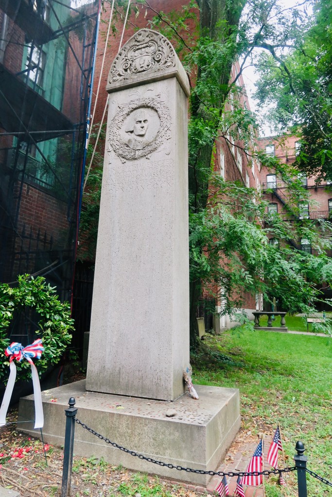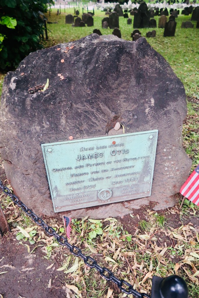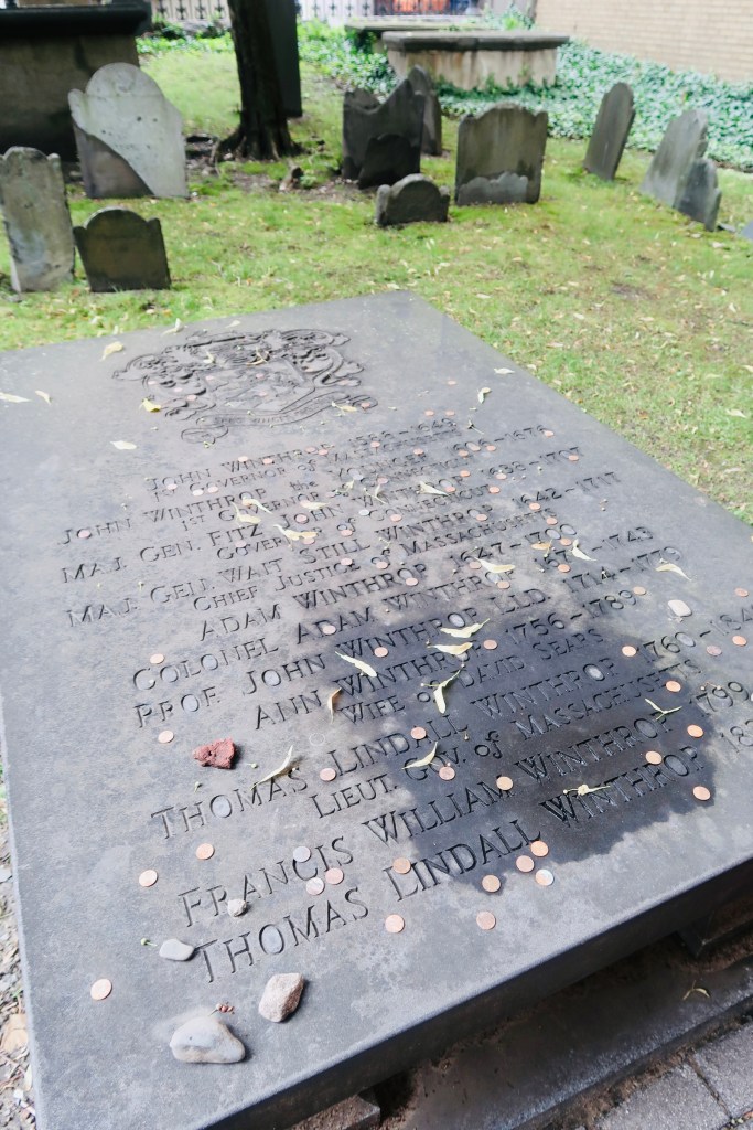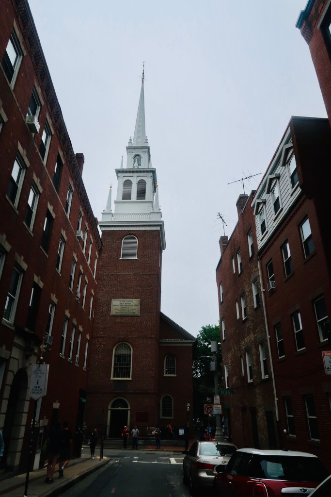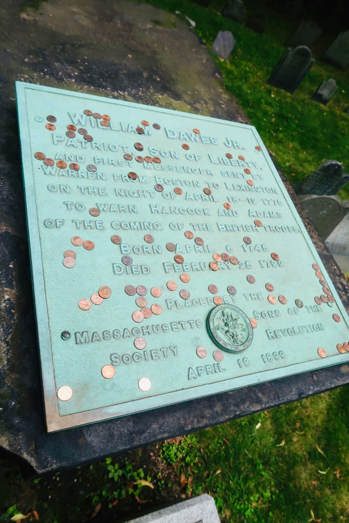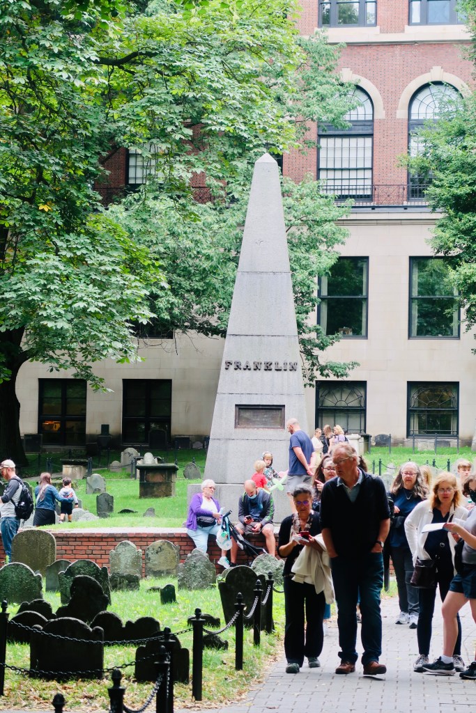 The next stop on The Freedom Trail that we made was to the Park Street Church and Granary Burying Ground. The church dates to the early 1800’s, but the burying ground is the real attraction at this stop. This cemetery is the final resting place for some of the key players of the founding and fighting for the colonies of America. This is the final resting place for around 5,000 of Boston’s own, though there are only markers and knowledge of 2,300. Notably buried here are Benjamin Franklin, Paul Revere, John Hancock, Samuel Adams, and a memorial for those massacred at the Boston Massacre. On these headstones you won’t find religious markers, rather these motifs of skulls with wings (to symbolize flying to heaven). Keep an eye out for grave markers- similar to those in Plymouth, there are metal markers signifying when the person participated in a momentous occasion, such as the Boston Tea Party. You are also able to go to another church and burying ground- the oldest in the city. We didn’t end up going in the church, but we did have a peak at the cemetery. Similar to Granary, this boasts several “big names”, the first woman off the Mayflower, Mary Chilton, William Dawes Jr, messenger sent to warn that the British were coming, as well as many others.